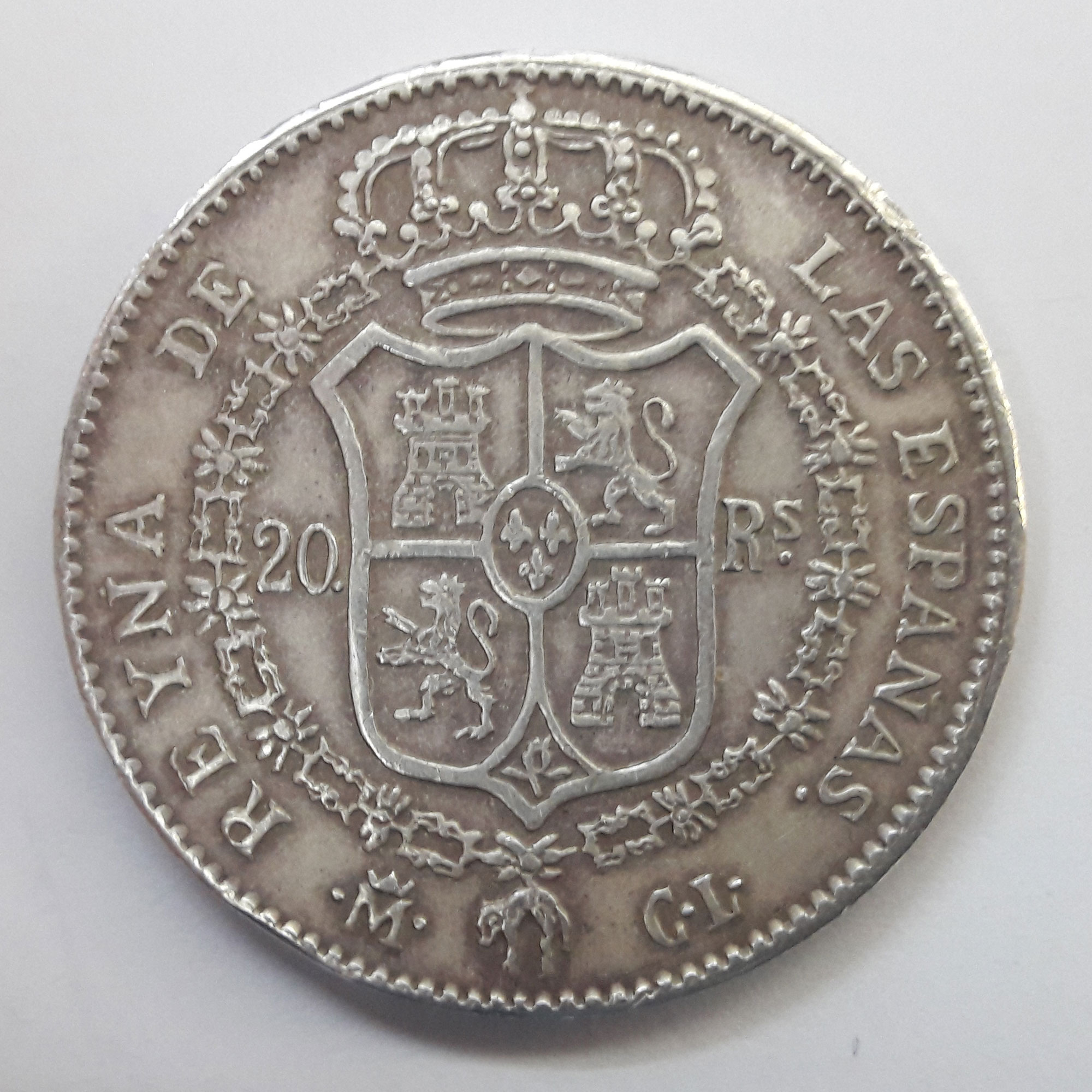 Date: 1837, Mint mark: Madrid. Country: Spain. Head: face of Queen Elizabeth II of Spain with lace of pearls tying her hair. Inscription: "Por la gracia de Dios y la Constitución 1837 Isabel 2a". Back: shield of Spain framed by the Toison. Inscription: "Reyna de las Españas CL. M. 20 Rs." CL. Assayer: CL. Edge: Ley -Patria- Rey. Ø 35mm, weigth: 27 g, silver. F.