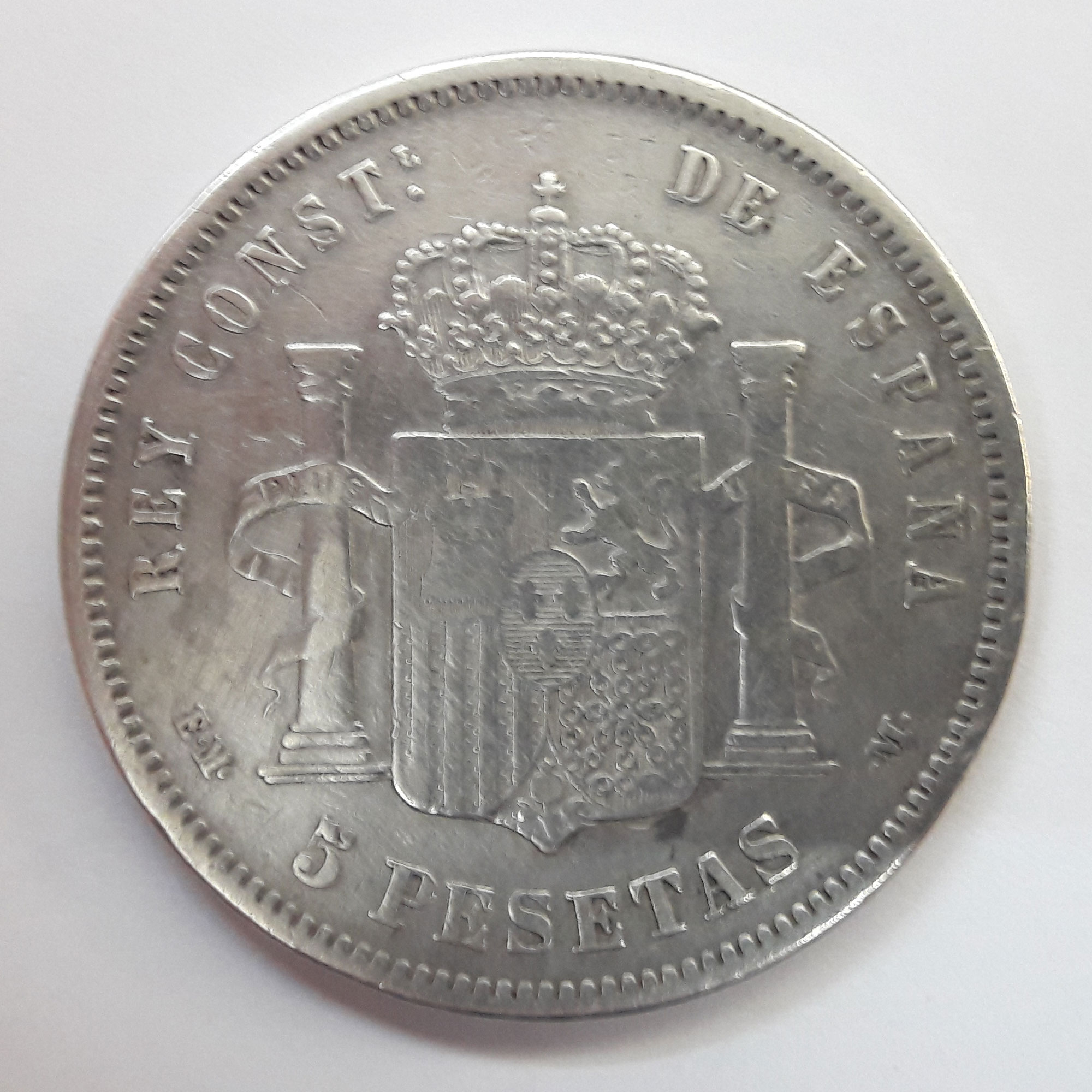 Date: 1879. Mint mark: Madrid. Country: Spain. Obverse: face of Alfonso XII framed with inscription: "ALFONSO XII POR LA G. DE DIOS * 1879*". Date in stars "18" y "79". Assayer: FS in the top of the neck (only S apreciated). Reverse: shield of Spain framed with the inscription "REY DE CONST (L). DE ESPAÑA .M. 5 PESETAS F.M." Edge: fleur de lis. . Ø 38 mm, weight: 24,5 g, silver.