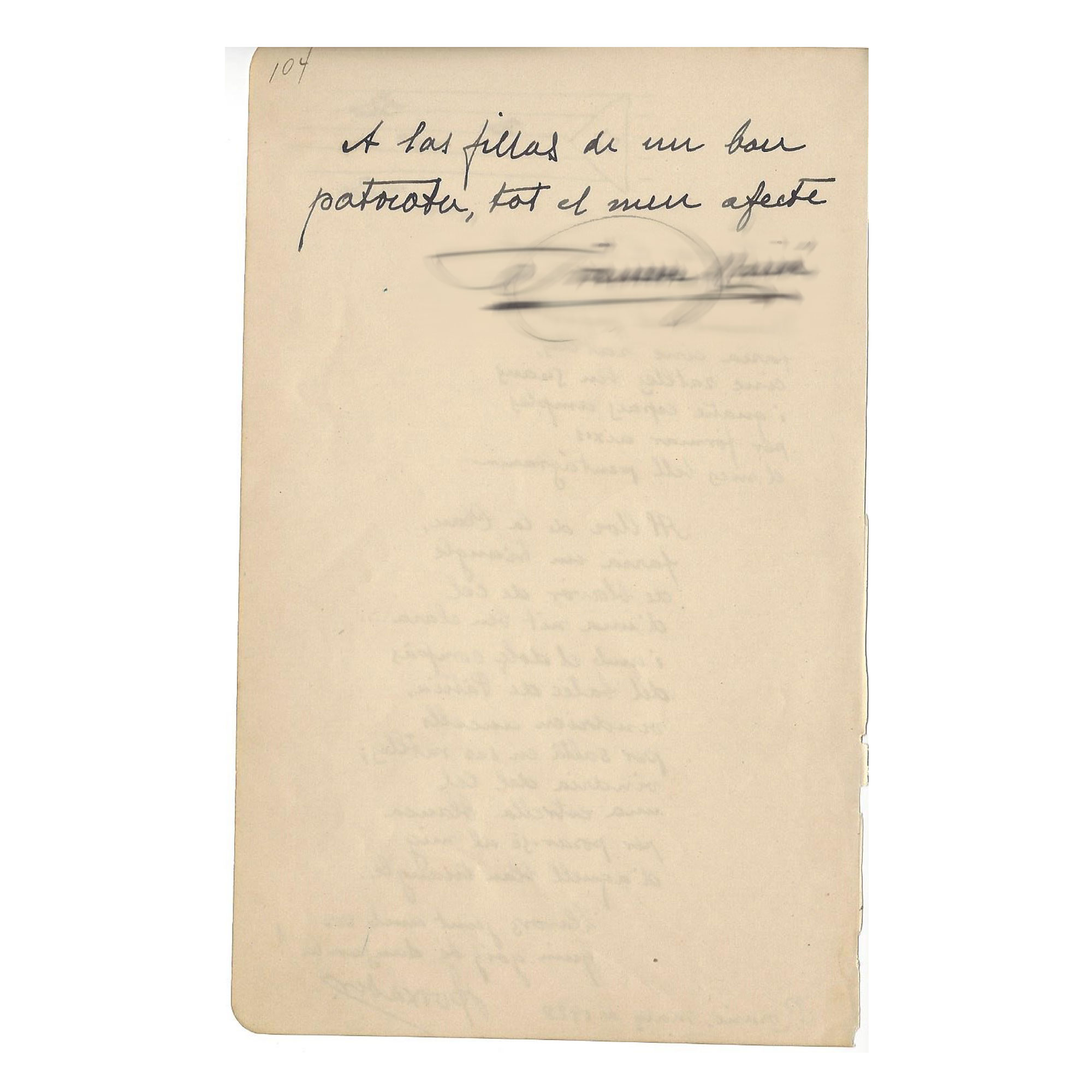 Unpublished verses of a sardana to the senyera (Catalan flag) by Ramon G. BOIXADER dedicated in May, 1928 to the patriot GELABERT (on the front of the document).